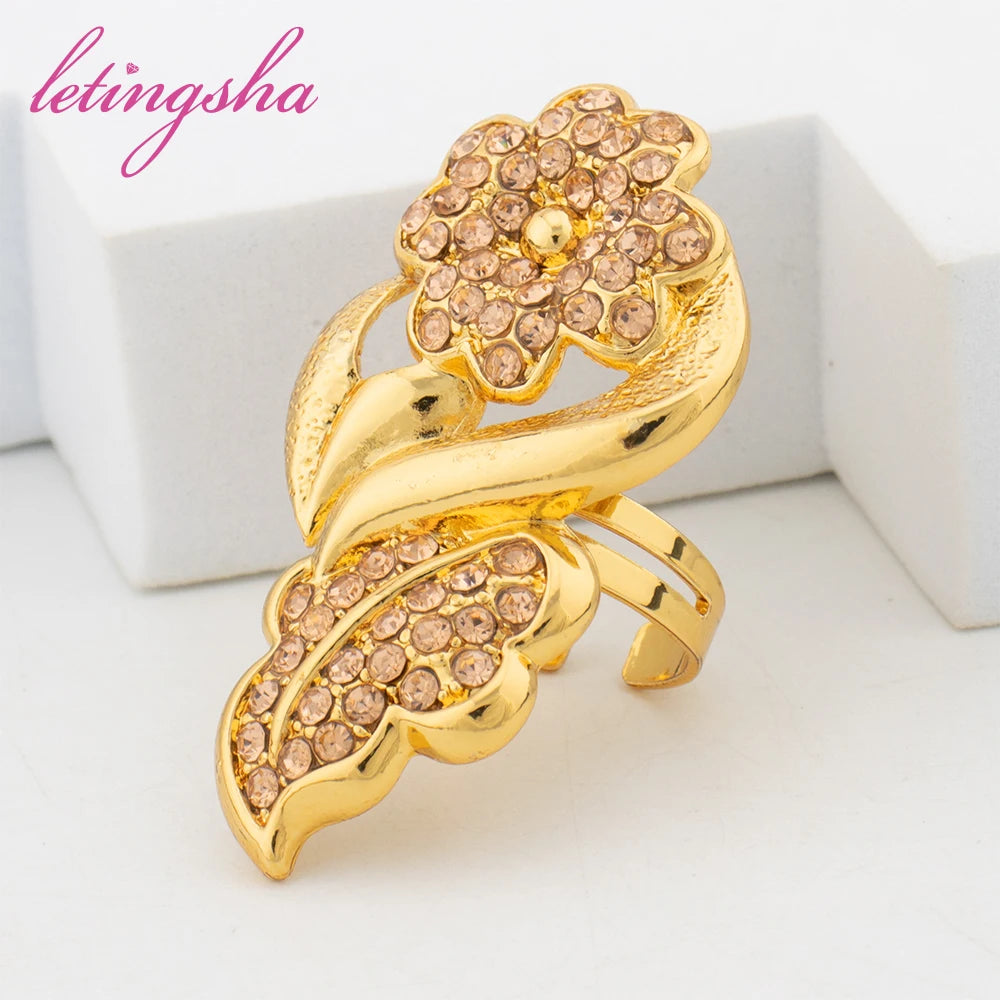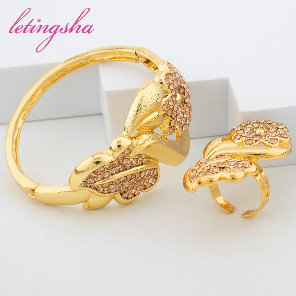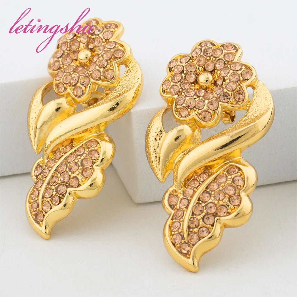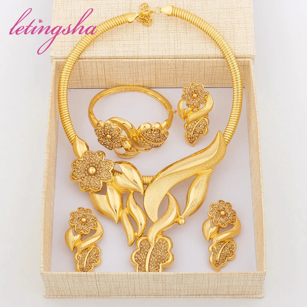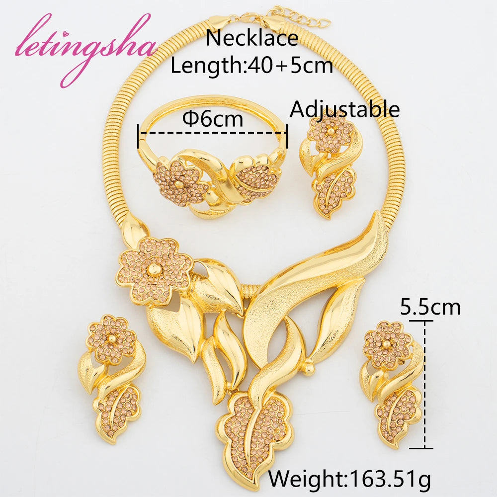 Floral Gold Jewelry Set with Zircon Necklace Earrings Bracelet Ring