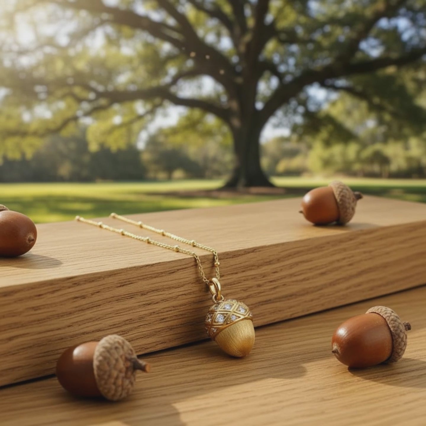 Gold-plated crystal acorn pendant on a satellite chain · A meaningful good-luck gift for fall outfits & nature lovers