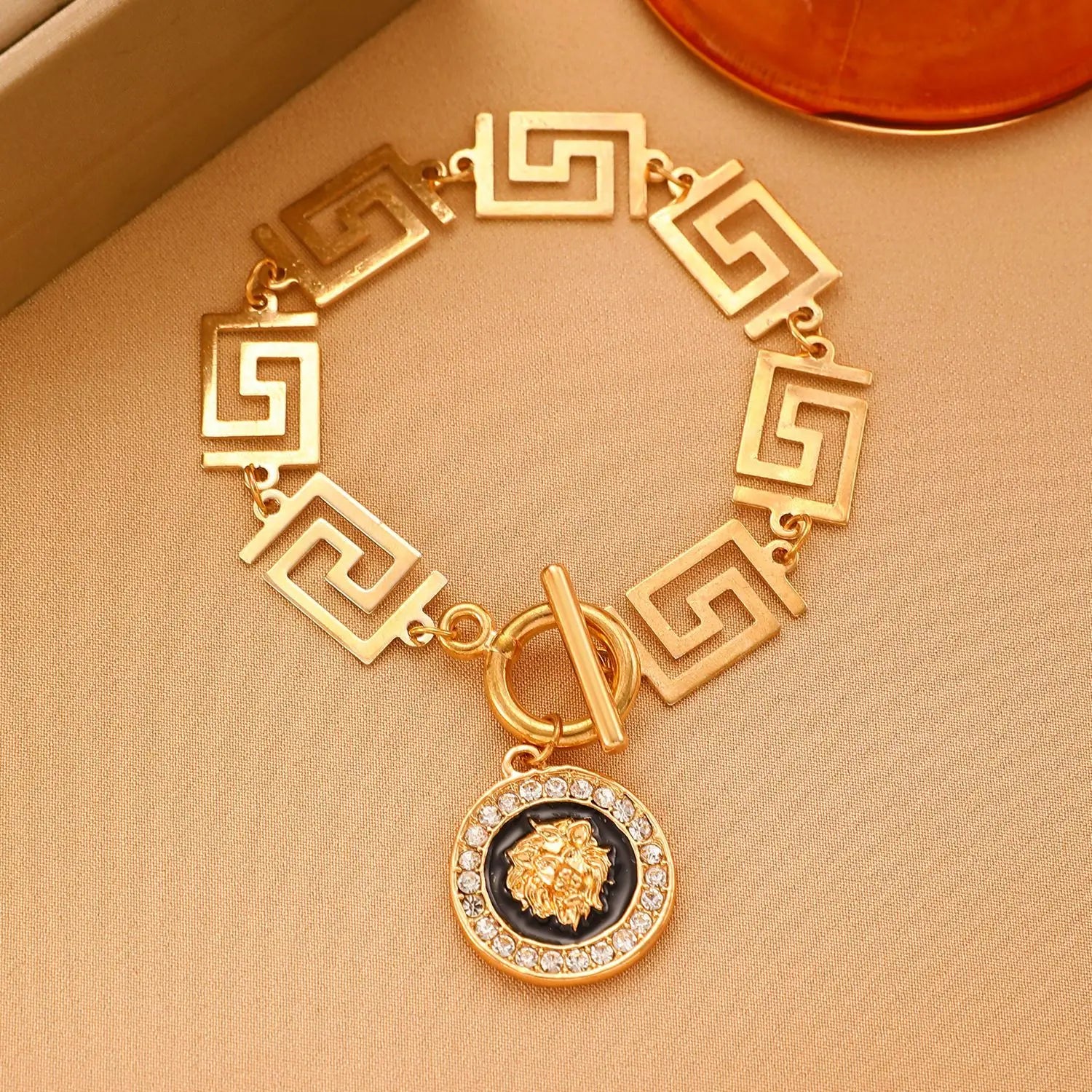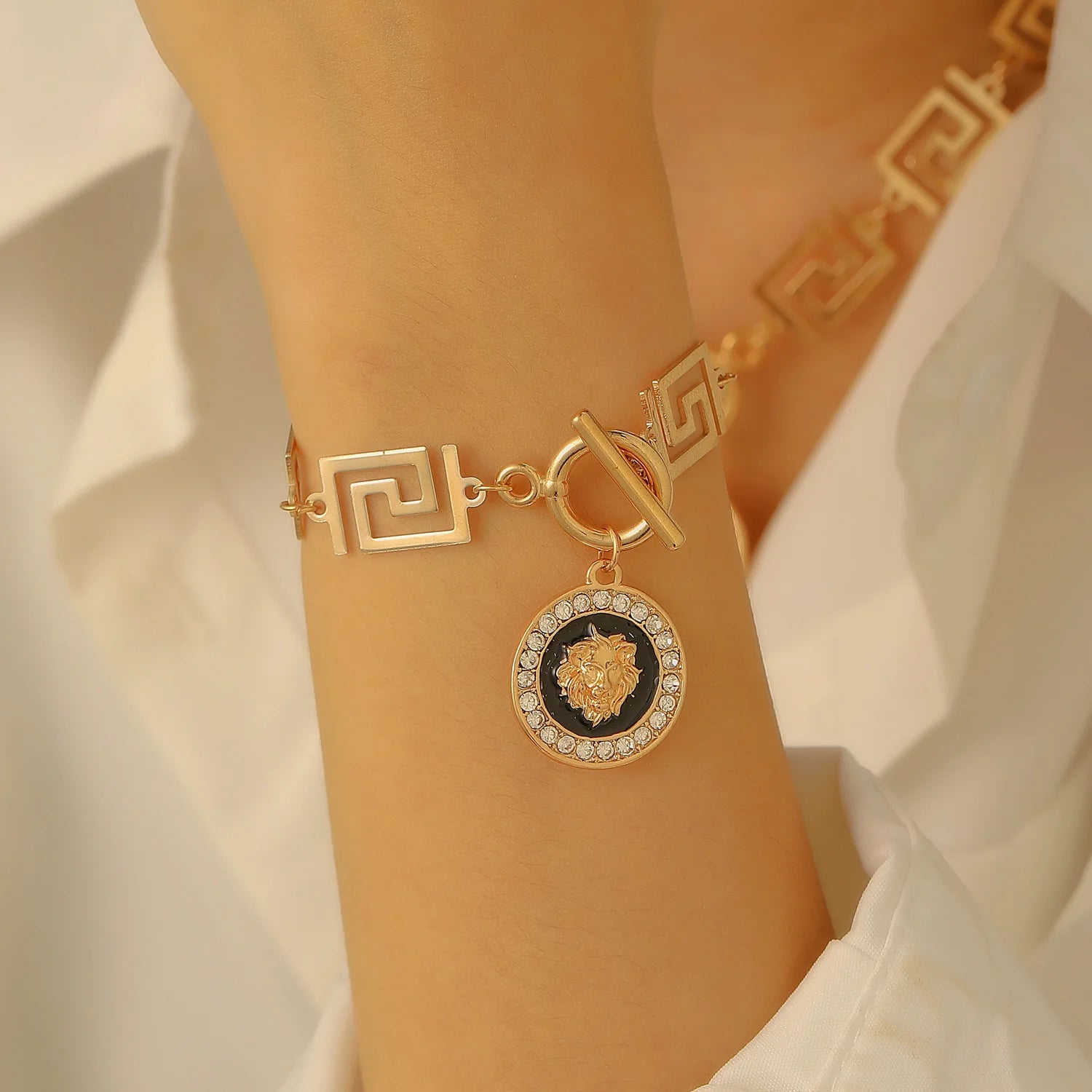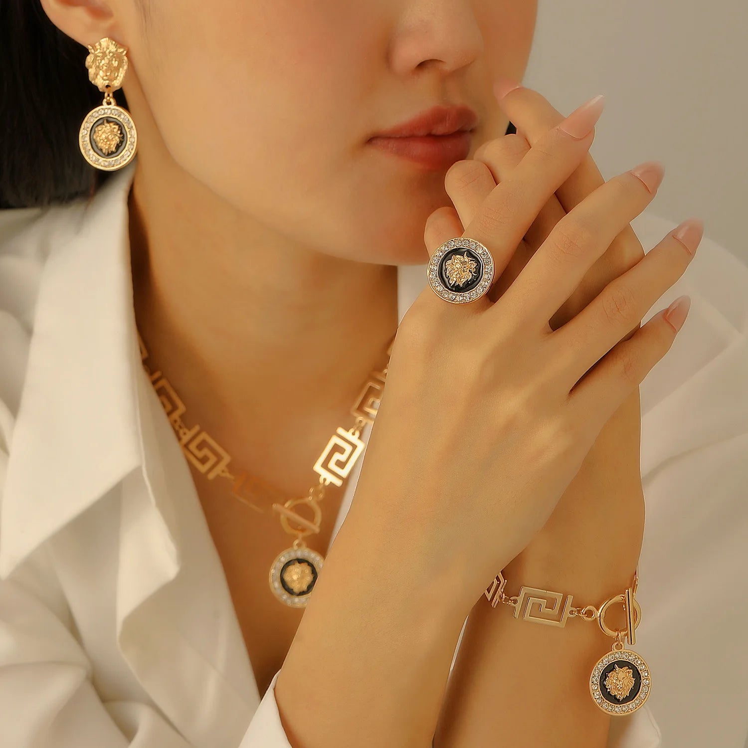 Make a bold statement with the Baroque Lion Head Jewelry Set — a vintage-inspired ensemble featuring a regal lion-coin motif and classic Greek-key links. Designed to turn heads, it adds couture drama to everything from blazers to evening silk.