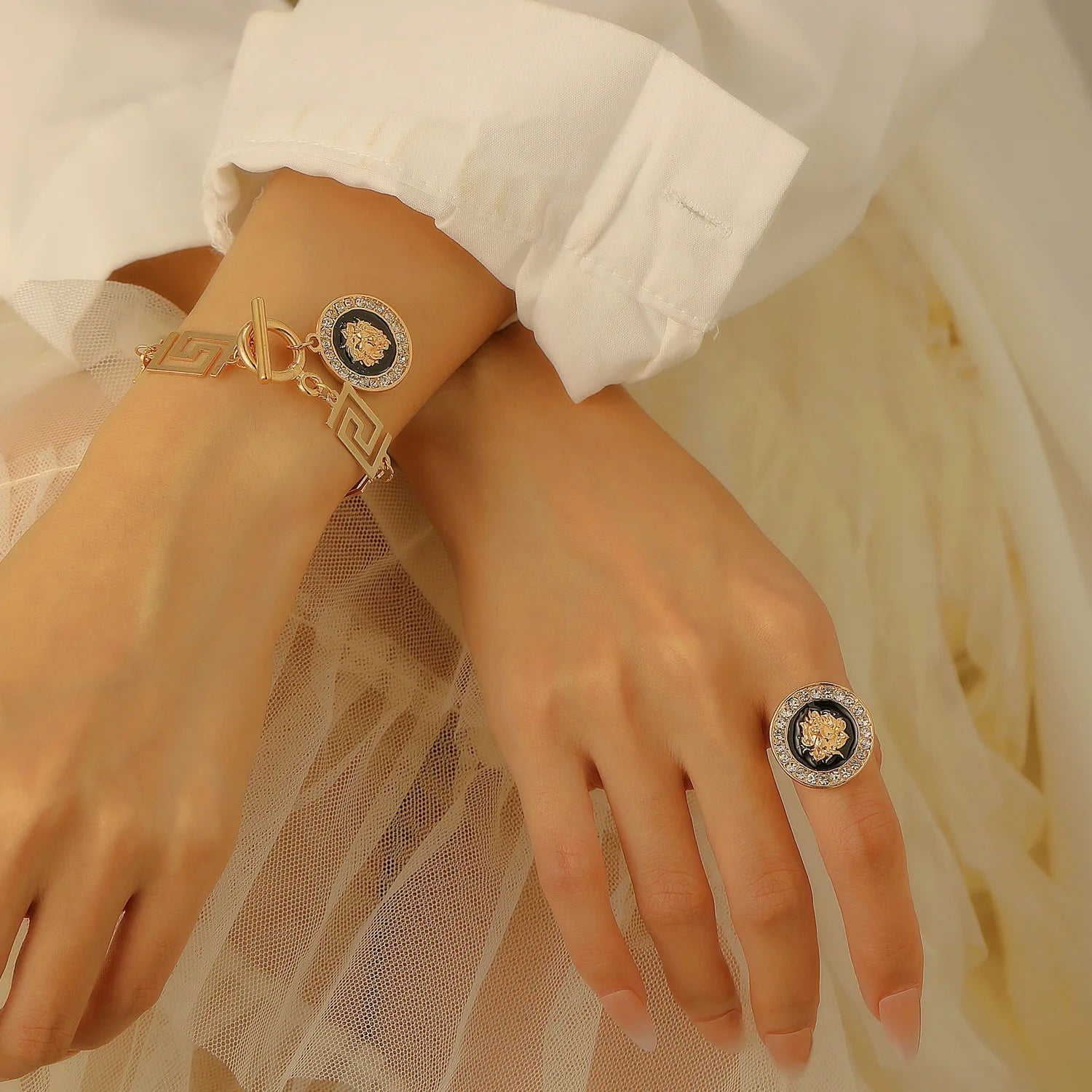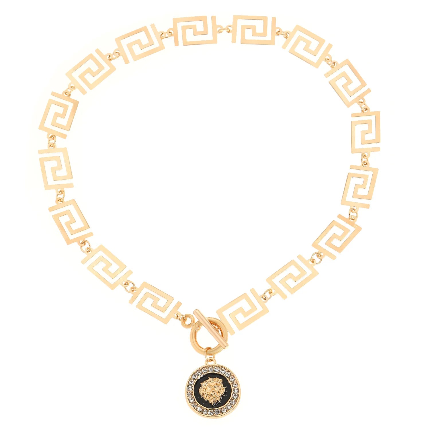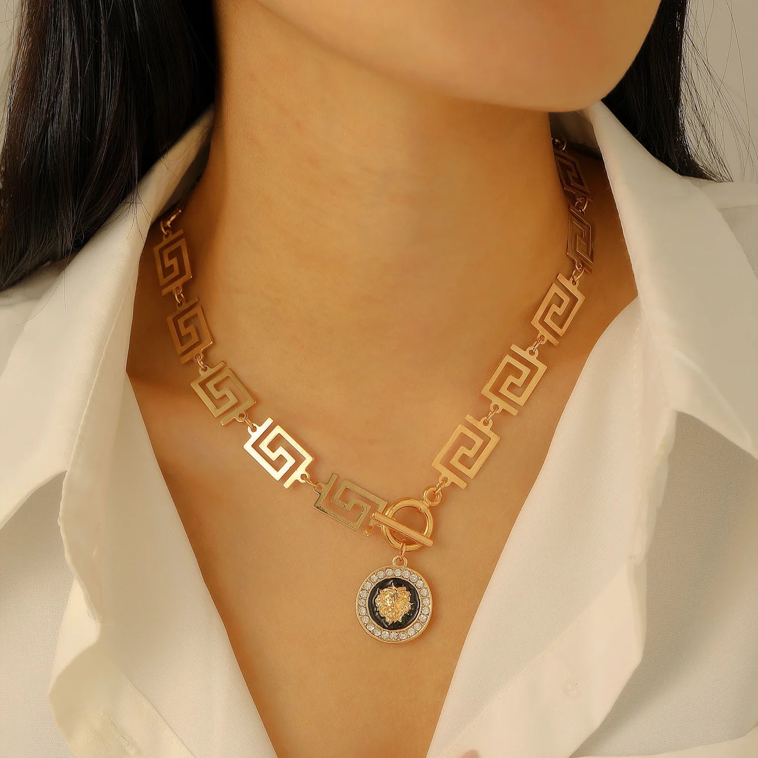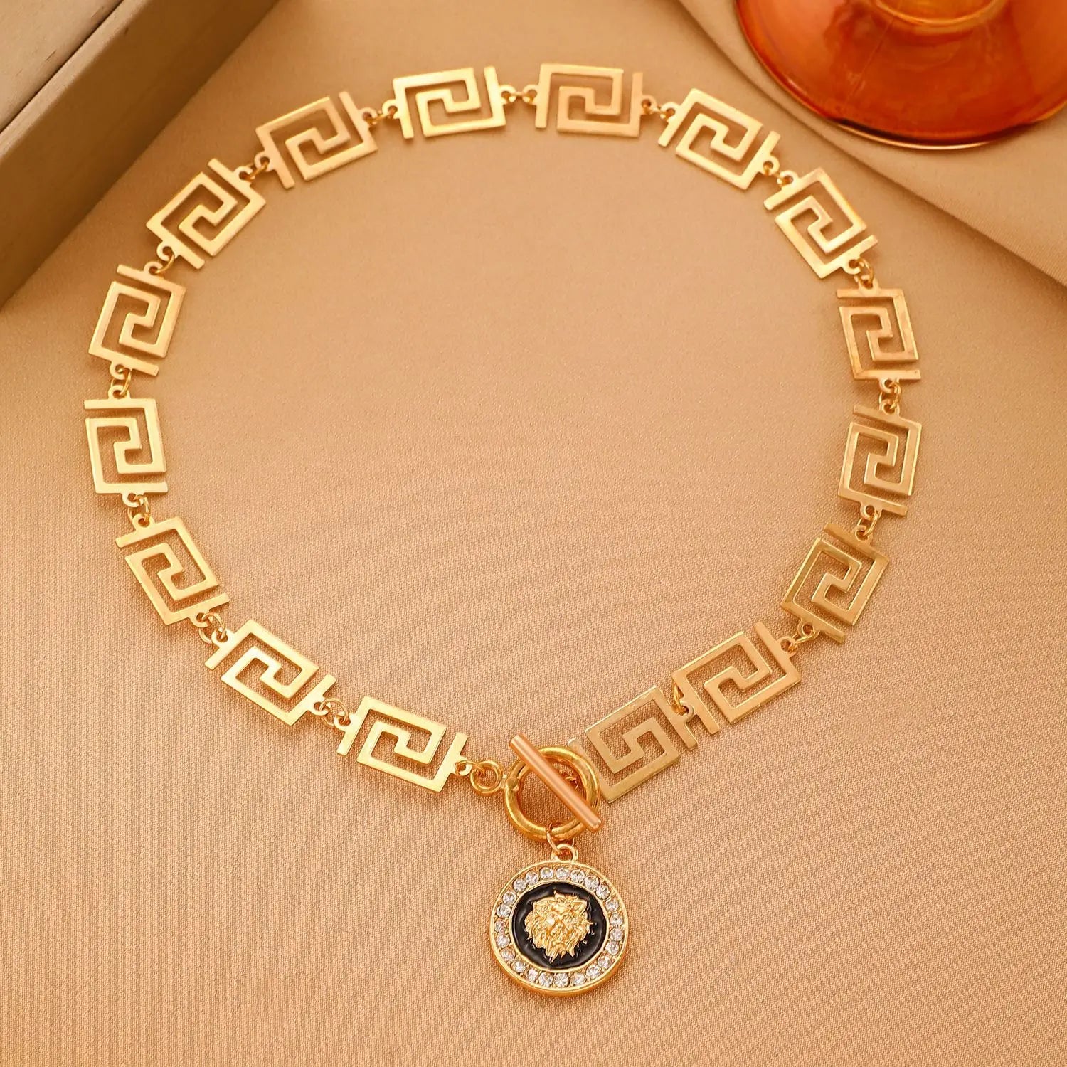 Make a bold statement with the Baroque Lion Head Jewelry Set — a vintage-inspired ensemble featuring a regal lion-coin motif and classic Greek-key links. Designed to turn heads, it adds couture drama to everything from blazers to evening silk.