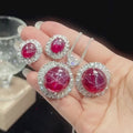 Bold, luminous, and impossible to ignore — the Starburst Ruby Halo Jewelry Set wraps deep ruby-red sparkle in a ring of brilliant white stones. Each cabochon-style gem shows off a starburst sheen, framed in a classic halo that feels both vintage and glam.